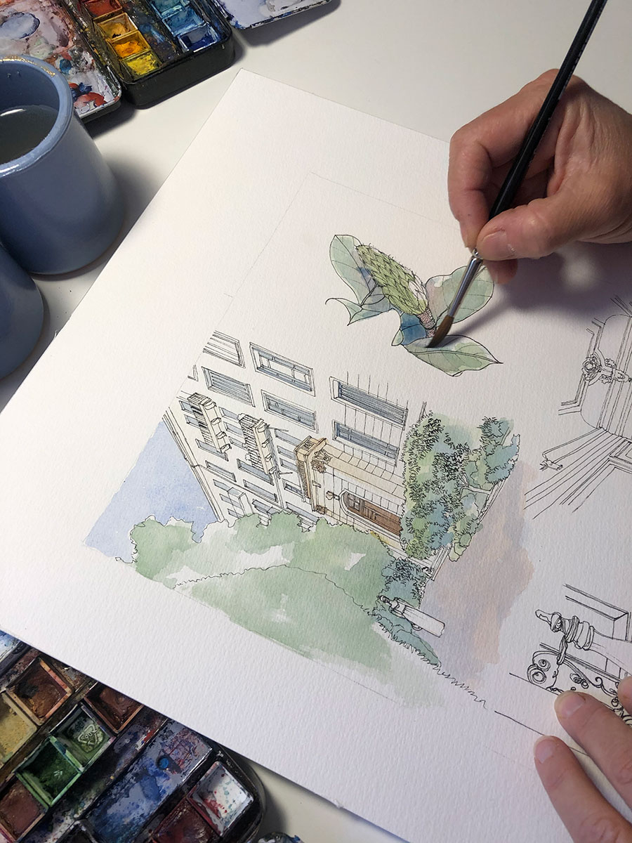 Illustrer un projet d’aménagement extérieur par un architecte est souvent onéreux et requiert du temps. Pour cette raison, ADC Nice collabore avec l’illustratrice niçoise Sylvie T. qui, après des études d’architecture, s’est installée au cœur du Vieux-Nice dans son atelier-galerie. Elle y réalise, entre autres, des dessins à l’encre de Chine et des aquarelles d’ouvrages architecturaux remarquables de notre région.